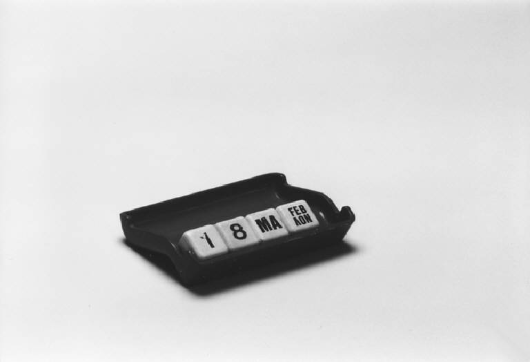 Modello di studio per calendario da tavolo. E' composto da n guscio a pianta rettangolare piegato in sezione laterale ad un terzo della profondità in modo da ottenere due ben distinte cavità: in quella anteriore sono contenuti quattro dadi sulle cui facce sono stampati numeri e lettere in modo da potere impostare numero/nome del giorno e nome del mese; in quella posteriore possono essere collocati piccoli oggetti. Il modello è laccato rosso.