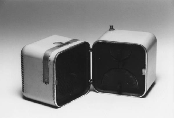 Modello di studio per radio portatile. E' composta da due prismi a sezioni quadrata tra loro incernierati in modo da comporre, quando chiusa un cubo allungato. Un prisma conteneva l'amplificatore e la maniglia a scomparsa per il trasporto; l'altro i comandi per l'accensione/spegnimento, la regolazione della sintonia e del volume e l'antenna a stilo estensibile. L'utilizzo della radio era possibile solamente in posizione aperta.