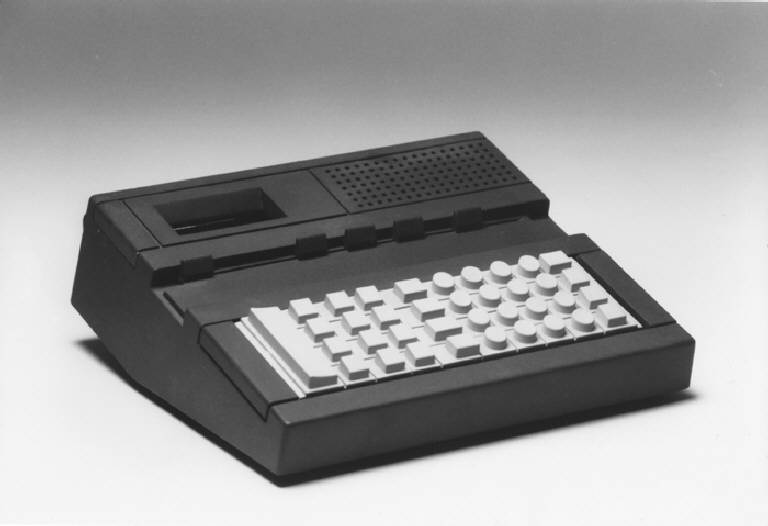 Modello di studio per calcolatrice da tavolo costituita da un solido prismatico a pianta rettangolare e a sezione a 'trapezio irregolare' realizzando, in tal modo, una inclinazione del piano di lavoro più favorevole per l'utilizzatore. Sul lato superiore è ricavata la tastiera, una profonda e larga incisione a tutta larghezza per il visore a led e il vano portarotolo per la stampa, affiancato da una griglia con fori circolari.