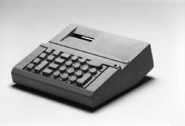Modello di studio per calcolatore elettronico da tavolo costituito da un solido prismatico a pianta rettangolare e a sezione a 'trapezio irregolare' realizzando, in tal modo, una inclinazione del piano di lavoro più favorevole per l'utilizzatore. Sul lato superiore è ricavata la tastiera, e il vano portarotolo per la stampa. La tastiera è su un piano parallelo a quello contenente il rotolo della carta ma ad una altezza maggiore. Il modello è di colore celeste.