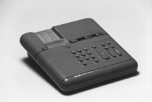 Modello di studio per calcolatore elettronico da tavolo costituito da un solido prismatico a pianta rettangolare. Il piano di lavoro inclinato per favorirne l'utilizzo, appare come una piastra di forte spessore dai bordi arrotondati sulle tre dimensioni. Sul lato superiore è ricavata la tastiera, e il vano portarotolo per la stampa.
