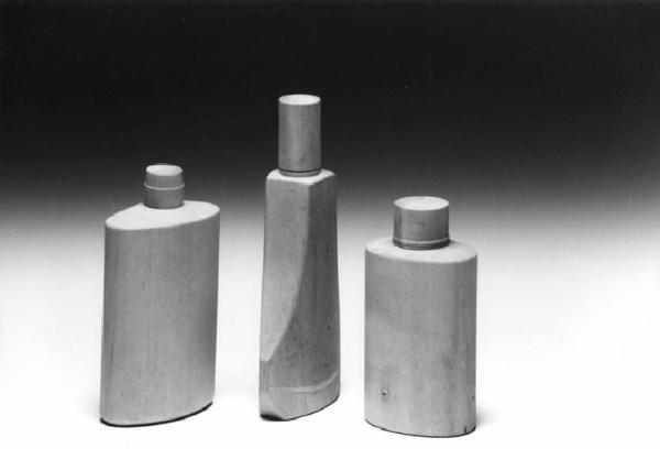 Modello di studio per contenitori da bagno per liquidi. Sono tre bottiglie di diversa altezza e capacità. Sono solidi a pianta ellittica, dotati di tappo cilindrico. Il modello più alto in elevazione presenta gradatamente un cambio di pianta da ellittica a quadrata.