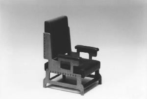 Modello di studio per una poltrona con struttura in legno e rivestimento (sedile, schienale, braccioli) in pelle.