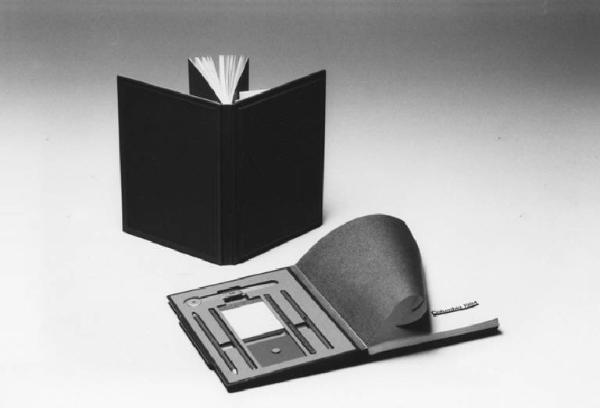 Modello di studio per agende attrezzate con copertine a spessore aumentato internamente contenenti scomparti sagomati atti a contenere vari accessori. Morfologicamente sono solidi prismatici a pianta e sezione rettangolare.