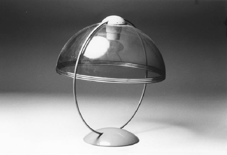 Modello di studio per lampada da tavola costituita da: base e diffusore a calotta sferica. Il diffusore è sostenuto da due ferri a semicerchio.