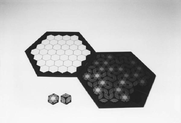 Modello di studio per gioco da tavolo. E' costituito da due tavole esagonali e da una serie di pedine realizzate con solidi a pianta esagonale con un differente trattamento della faccia superiore: a spicchi o a unghie.