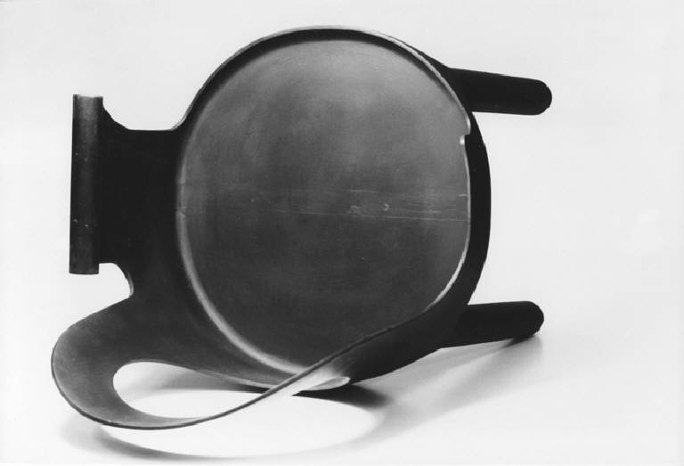 Modello di studio per sedia a seduta e schienale circolare. Il modello è servito per valutare la possibilità di inserimento del bracciolo.