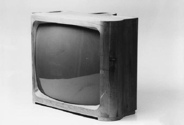 Modello di studio per televisore da tavolo costituito da un solido prismatico con pianta assimilabile ad un rettangolo affiancato, a metà del lato lungo posteriore, di un semicerchio. Tale 'protuberanza' corrisponde alla forma del tubo catodico.