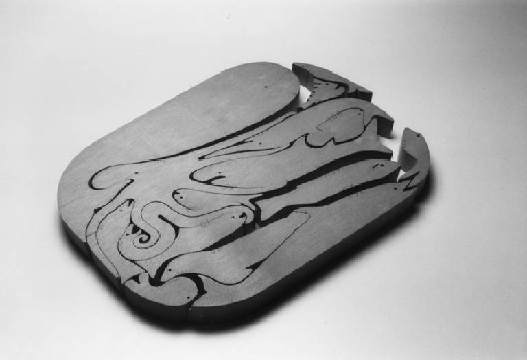 Modello di studio di gioco ad incastro per bambini. E' composto da sedici sagome stilizzate di pesci. Se posizionate in maniera corretta le figure formano un rettangolo dagli angoli arrotondati.