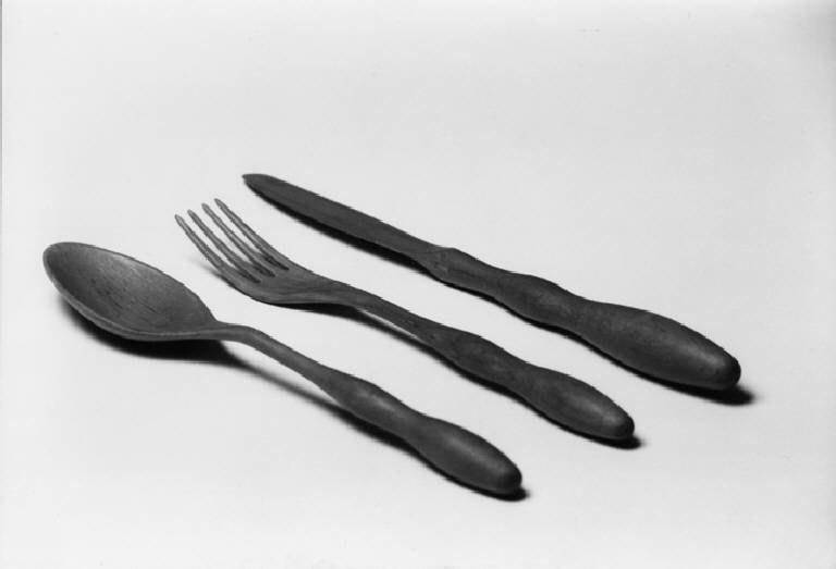 Modello di studio per un set di posate, presentato al concorso promosso dalla Reed & Burton, nel quale è evidente la ricerca ergonomica sull'impugnatura dei tre diversi elementi, caratterizzata da successive variazioni della sezione.