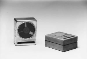 Modello di studio per orologio da tavolo. E' un solido prismatico a pianta rettangolare con un fianco caratterizzato da un'apertura circolare (contenente il quadrante con le lancette) e una larga fessura rettangolare con i bordi arrotondati. Una profonda incisione corre continua sui fianchi laterali (corrisponde alla linea di connessione delle due parti componenti l'involucro).