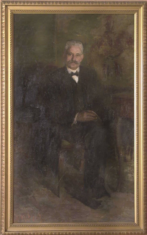 - NOTIZIE STORICO CRITICHE Collocabile tra le opere dei primi anni del Novecento, questo ritratto, assieme al suo pendant raffigurante Maria Luisa Zinelli Cogi, moglie di Luigi Cogi, fa parte di un gruppo di opere realizzate dall'Andreoli e oggi conservate presso la Pinacoteca Repossi che testimoniano una fase cruciale del percorso artistico dell'artista, impegnato nella rilettura della tradizione del ritratto realistico di matrice lombarda soprattutto attraverso l'essenziale apporto (quanto a libertà espressiva e non convenzionalità costruttiva) della pittura della Scapigliatura che, anche qui, emerge attraverso l'abbreviatura del ductus pittorico e l'ammorbidimento della grumosità materica a tutto vantaggio di una più sospesa delicatezza luministica che conferisce al ritratto un misto di sentimento colloquiale e di più riposta, delicata lettura introspettiva che l'artista, come in altri ritratti, accentua portando l'accento della sua pittura sulla fisionomia del volto e su alcuni particolari caratterizzanti (come l'abbigliamento elegante e il sigaro) che vengono scandagliati attraverso una pennellata velocissima e abbreviata eppure sugosa e carica, lasciando poi, con un progressivo impoverimento della materia pittorica, il resto allo stato quasi di abbozzo o, piuttosto, in una sorta di generica sfocatura dell'insieme che restituisce dell'ambiente solo i tratti essenziali e gli accostamenti cromatici di superficie. Contrariamente a quanto proposto da Terraroli (1991, p. 51), non sembra plausibile pensare che l'artista abbia ritratto il Cogi nell'atmosfera romantica del suo atelier; piuttosto è da credere che si tratti dell'interno della casa dell'effigiato e che il dipinto alle sue spalle (si confronti la stessa tonalità prugna del lungo vestito) altro non sia che il ritratto della moglie del Cogi, forse un simbolico riferimento non tanto a un'altra opera dell'artista ma, piuttosto, al legame spirituale tra i due coniugi ripreso attraverso il rimando visivo dell'altro ritratto. Con testamento olografo del 17 aprile 1924 il cav. Luigi Cogi legava alla raccolta Repossi questo ritratto e quello della moglie Maria Luisa Zinelli (cfr. scheda D00006). Presso la Biblioteca Morcelli (Fondo Ginnasio, b. 1) si conserva una lettera di Fogliata Giovanni, allora presidente della Congregazione di Carità, datata 23 gennaio 1932 ed indirizzata a Lancini Pietro, allora bibliotecario della Morcelliana e direttore della Pinacoteca Repossi, con la quale si incarica lo stesso Lancini di ritirare dalla sig.ra Rina Zinelli di Brescia i due ritratti qui sopra citati per essere collocati nella Pinacoteca Repossi, ottemperando così al testamento olografo del cav. Cogi.