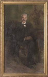 Luigi Cogi è raffigurato al centro della tela, seduto a gambe accavallate su una sedia; nella parte destra della tela si vede un tavolo dietro il quale sembra di intrevedere un quadro (il ritratto della moglie? cfr. campo NSC e scheda D00006); tiene le mani appoggiate alle gambe; fra le dita della mano destra regge una penna.