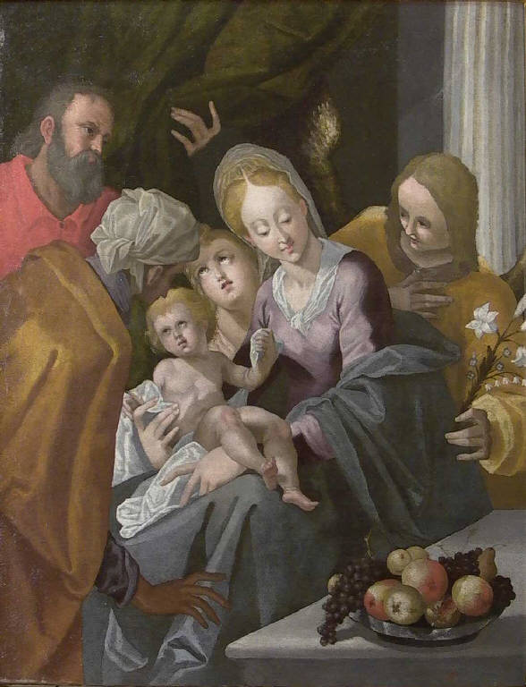 - NOTIZIE STORICO CRITICHE La piccola tela è stata identificata da Fusari (2002, p. 53) con la "bellissima Sacra famiglia d'uno scolaro del Hostaek" di cui parla Alessio Antonio Rota dicendola nella sua casa, insieme al San Giacomo maggiore che egli attribuiva a Caravaggio. Vedendola già censita nell'Inventario del 1878 Maggi (2003-2004, p. 118) ha ritenuto non potesse provenire dal lascito Rota e si è impegnato in un funambolico quanto farraginoso ragionamento per riconoscere nella tela di cui parla il Rota il Riposo durante la fuga in Egitto (inv. n. D00014), effettivamente entrato nelle collezioni della Pinacoteca Repossi per lascito di Marianna Rota nel 1926. Tuttavia la famiglia Rota, tramite i suoi rappresentanti, lasciò a più riprese opere alla pinacoteca clarense e giova ricordare anche che lo stesso Giovan Battista Rota, poi vescovo di Lodi, fu per un certo periodo bibliotecario della Morcelliana e non si può escludere che proprio lui lasciasse questa teletta alla pinacoteca (in generale in LA e in TU si è segnato come ingresso in Pinacoteca il riferimento cronologico "1878 ante" perchè la tela in questione compare per la prima volta nell'Inventario della Pinacoteca del 1878). D'altro canto, per quanto non espresso da Alessio Antonio, il nome Hostaek (che dovrebbe storpiare quello corretto di Aachen) si riferisce a un artista di ambito nordico, e non certo a un pittore tutto sommato ascrivibile all'ambito centro italiano com'è il caso del citato Riposo durante la fuga in Egitto. Tanto più che ora, tolti i dubbi sulla derivazione veramente nordica del dipinto, non è più necessario nemmeno ascriverlo alla maniera di Lelio Orsi per farlo rientrare a qualche titolo nell'ambito della scuola italiana. Il dipinto originale (per il quale si rimanda a Jacoby J. 2000, pp. 115-116 n. 23) è oggi perduto; fu realizzato da Hans (o Jan) van Aachen, artista attivo alla corte praghese di Rodolfo II ed è noto solo attraverso un'incisione di Aegidius Sadeler II (The Illustrated Bartsch, vol. 72, parte I - supplemento, New York 1997, pp. 132-134, n. 082) che dovette determinarne la grande fortuna e l'ampia circolazione di copie tra le quali una (assai variata), attribuita a Simone Cantarini conservata all'Accademia Carrara di Bergamo (inv. 578). Per questa composizione van Haachen, che - secondo suo solito - realizza strutture costruite sulla diagonale, con figure allungate e preziose, pare ispirarsi al Riposo durante la fuga in Egitto di Veronese e ai preziosismi alambiccati e funambolici di Parmigianino. Quest'ultimo elemento, d'altro canto, motiva l'ascrizione al Parmigianino della tela della Pinacoteca Repossi fin già dalla fine dell'Ottocento.