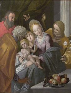 Al centro del quadro la Madonna tiene Gesù Bambino sulle sue ginocchia; in primo piano a sinistra, di spalle, si trova sant'Anna che conversa con il Bambino; alle spalle di Maria, da sinistra a destra, si vedono san Giuseppe, un angelo e l'arcangelo Gabriele che porge un giglio bianco alla Madonna; in primo piano a destra, un inserto di natura morta costituito da un piatto ricolmo di frutta appoggiato su un tavolo.