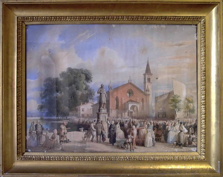 - NOTIZIE STORICO CRITICHE Nella Distinta del 1854 il dipinto è descritto al numero 3 come "Una predicazione con statua di S. Carlo con cornice dorata". Presente negli inventari successivi è riconosciuta col titolo de "La missione" e con il nome dell'artista Giuseppe Mazzola solo in occasione del temporaneo trasferimento a Lucca nel 1918. La scena si svolge su una piazza, davanti a una chiesa; importante è la presenza della statua di san Carlo Borromeo che permette di accertare l'identificazione (insieme al supporto cartaceo) con il dipinto del lascito Repossi. L'acquerello, come ha evidenziato Maggi, è una delle rare opere del pittore milanese Giuseppe Mazzola, operante nel capoluogo lombardo tra il 1845 e il 1868. Per questo l'acquerello della Pinacoteca Repossi oltre a far parte del ridottissimo corpus di opere dell'artista (non più di una ventina) è da porre all'inizio della sua carriera artistica; presentato all'Esposizione di Brera del 1845 con il titolo "La Missione", fu acquistato dalla Società di belle Arti di Milano e fu vinta dal Repossi quando fu messa in palio nell'estrazione del 5 febbraio 1846 (Maggi, 2003-2004, p. 107). L'impostazione della scena, vivida di particolari di genere e con qualche intonazione realistica deve molto nella sua impostazione all'arte dei fratelli Canella e, in genere, alla pittura milanese di veduta della prima metà del secolo. La tecnica ad acquerello permette all'artista di giocare sui chiarissimi e di dare all'insieme un'intonazione leggera e solare.\n\nSocietà delle belle arti di Milano 1845, p. 5 art. 1: si tratta dell'art. 1 del regolamento della società che dice che "La Società di Belle Arti, mediante un contributo annuo pagabile da ogni Socio, raccoglie un fondo da erogarsi, ad ogni ricorrenza della pubblica Esposzione, nell'acquisto di un numero di oggetti d'arte proporzionato alla rendita disponibile, da essere poi distribuiti a sorte fra i Soci".\nQuesto articolo spiega la prassi dell'astrazione grazie alla quale nel 1846 Repossi ottenne il quadro della Missione, come documenta l'eklenco opere deel 1846 e la nota manoscritta accanto alla voce del Mazzola:\nSocietà delle belle arti di Milano 1846, p. 42 n. 55 (nel paragrafo: Premi acquistati dalla Società delle belle arti all'Esposzione in Brera del 1845 [e estratti a sorte fra i soci come premio]: Mazzola Giuseppe - La Missione - Acquarello a colori, piccole figure. Accanto vi è una nota a matita che dice che tale opera è stata vinta da Repossi Pietro av di Chiari.