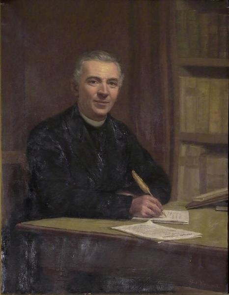 - NOTIZIE STORICO CRITICHE Don Luigi Rivetti, storico clarense e direttore della Biblioteca Morcelliana di Chiari, fu amico ed estimatore del bergamasco Giuseppe Riva; a lui affidò diversi lavori e restauri per la parrocchia di Chiari e a lui fece realizzare il suo ritratto che lo vede seduto alla scrivania, intento a scrivere, avendo davanti a sé il manoscritto degli Artisti Chiaresi, una delle molte opere stese dal Rivetti e pubblicata sulla rivista Brixia Sacra nel 1917, l'ultima, perciò, uscita dalla sua penna prima che il ritratto venisse portato a termine. Nella tela si nota chiaramente l'orientamento stilistico del Riva la cui pittura, corretta e accademica ma, allo stesso tempo, incline a un certo eclettismo, si contenta di proporre un ritratto ben condotto ma privo di qualsiasi spessore psicologico. Si tratta, cioè, di un dipinto di rappresentanza nel quale il carattere ufficiale, seppure ammorbidito dal viso affabile del sacerdote, mantiene un'insopprimibile aura di fredda ufficialità.