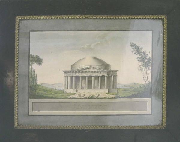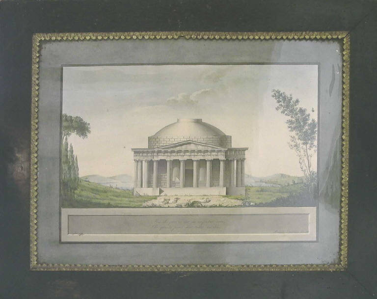 - NOTIZIE STORICO CRITICHE L'acquerello mostra, ambientato in un luogo boschivo, un tempietto dorico di fantasia, avvicinabile nella morfologia al romano Pantheon, ma assai prossimo anche all'invenzione del cosiddetto Tempio di Possagno, progettato dallo scultore Antonio Canova. Esercitazione accademica ancora dominata dalla più stretta osservanza dei canoni del Neoclassicismo.