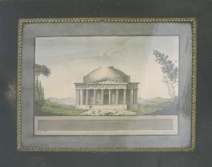 In un paesaggio collinare, davanti ad un lago, si trova un tempietto classico di forma circolare con pronao a colonne doriche e timpano triangolare. Alcune piante chiudono il campo visivo a destra e a sinistra.