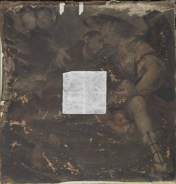 - NOTIZIE STORICO CRITICHE Grazie alla scritta "Copiato lano [sic!] 1713", posta sul telaio, è possibile datare con certezza il dipinto il cui pessimo stato di conservazione non consente una soddisfacente lettura. Il tema, abbastanza usuale nella devozione francescana, aiuta a collocare il dipinto nell'alveo della produzione (meglio riproduzione) quasi dilettantistica di dipinti destinati a decorare gli ambienti dei conventi francescano. Per questo non è da escludere - sebbene non sia certa la provenienza dell'opera - che il dipinto provenga dal convento di San Bernardino di Chiari. I caratteri stilistici lasciano intendere che l'ignoto artista si sia rifatto a un quadro della prima metà del Seicento, così almeno è possibile supporre guardando alla figura monumentale dell'angelo che riprende stilemi di provenienza lombardo-milanese non lontani dalla pittura di Camillo Procaccini o dei Fiamminghini, oltre che alla generale tendenza all'horror vacui pure di matrice procaccinesca. Inserti più propriamente settecenteschi sono, invece, le due testine d'angelo nell'angolo a sinistra in alto, il cui trattamento più leggero e aggraziato fa riferimento a un tipo di pittura non lontana dall'ambiente bresciano dell'inizio del Settecento. Un esame più approfondito, permesso anche da un necessario restauro, potrà - se non giungere alla paternità dell'opera - mettere meglio in evidenza caratteri stilistici e qualitativi al momento assai difficili da decifrare.