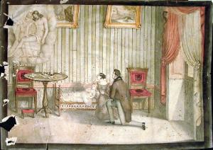 - NOTIZIE STORICO CRITICHE Il piccolo acquerello, rovinato e sgualcito su tutti i margini, segue i caratteri di rappresentazione tipici dell'ex voto: due genitori, genuflessi al capezzale del figlio malato, invocano la Vergine addolorata perché interceda per la guarigione del piccolo. Tecnicamente il dipinto mostra diverse debolezze, soprattutto nelle proporzioni dei personaggi rispetto ai mobili e all'arredamento che risulta oltremodo sovradimensionato. Tuttavia la minuta descrizione proprio di questi oggetti restituisce fin nei minimi particolari (perfino nelle stoviglie posate sul tavolino circolare) i caratteri di un interno borghese ai primi dell'Ottocento; la foggia dei vestiti e l'arredamento rimandano, infatti, allo stile impero la cui persistenza nei moduli e nel gusto continua fin verso la metà del XIX secolo.