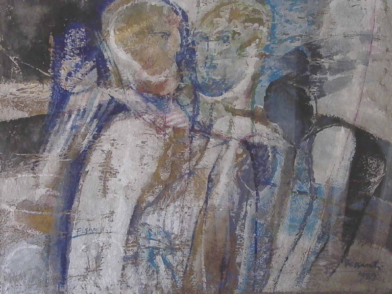 - NOTIZIE STORICO CRITICHE Figure sintetiche, come nel caso di altri lavori della fine degli anni Ottanta, si palesano in questo dipinto nel quale prevalgono le dominanti azzurre. Il segno, allargato e franto, la pennellata a tratti ispessita a tratti ridotta all'essenza, valgono come segnali per individuare le presenze ridotte al minimo della descrizione e rivolte verso una comunicazione non verbale dei moti d'animo.
