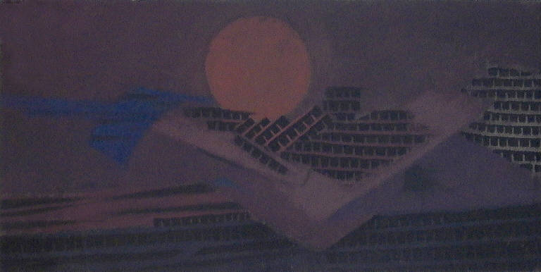 - NOTIZIE STORICO CRITICHE Appartenente per tematica e per realizzazione tecnica ai Paesaggi combusti, il dipinto si situa in un momento nel quale l'artista, abbandonata la figurazione, si avventura nel campo dell'astrazione sempre, però, attento ai valori basilari della rappresentazione. Da qui nascono questi speciali paesaggi che del concreto mantengono la scansione e la purificazione visuale, compiuta attraverso l'astrazione degli elementi a vantaggio di forme selezionate, si incontra con l'esigenza di concretezza espressa dalla scelta del supporto che prevede l'utilizzo di materiale sabbioso. La citazione del concreto e la scansione del reale nell'astratto sfoceranno poco più avanti, con rinnovato gusto per la figurazione, nei verdi giardini del mito, alla riscoperta del senso remoto dell'essere.