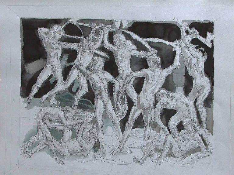 - NOTIZIE STORICO CRITICHE L'artista riprende la famosa incisione di Antonio del Pollaiolo (uno degli esemplari si conserva nel fondo calcografico della Fondazione Morcelli Repossi, inv. n. I00001) mettendone in risalto gli elementi costruttivi: le figure sono ridotte a strutture schematiche la cui volumetria è suggerita da linee che definiscono solo in parte la muscolatura e da interventi ad acquerello che si approfondiscono nello sfondo. Sopra al disegno vero e proprio Leddi ha posto un foglio da lucido sul quale, attraverso linee e archi, si fa palese la struttura. Come sempre nell'opera di Leddi la citazione da figure del passato diventa motivo di scavo strutturale e l'intenzione poetica è mediata dal continuo studio che disvela gli elementi portanti e chiarificatori della figurazione.