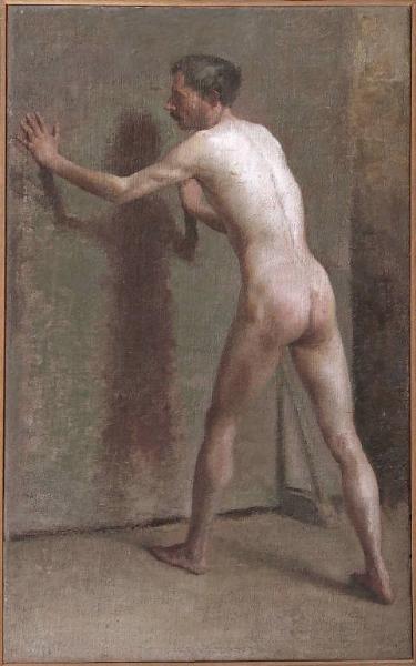 - NOTIZIE STORICO CRITICHE Il dipinto è collocabile tra le opere eseguite dall'artista nell'ultimo decennio dell'Ottocento in prossimità a dipinti come il Nudo muliebre del 1890-1894 o Il filosofo del 1896. Sarebbe possibile forse arretrare la cronologia di qualche anno tenendo presente il carattere di studio della figura, con tutta probabilità eseguita come ripresa dal vero negli anni degli studi compiuti presso l'Accademia di Brera. Si nota qui l'attenzione al dato naturalistico e il controllo della materia pittorica. La tavolozza ridotta a poche gamme raffreddate è caratteristica delle opere dei primi anni Novanta.