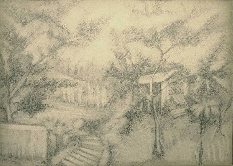 In primo piano vi sono tre alberi attraverso i cui rami si vede, più in profondità, un cascinale e probabilmente un lagheto. Fra il primo ed il secondo albero da sinistra si scorge una scalinata fiancheggiata da un muretto.