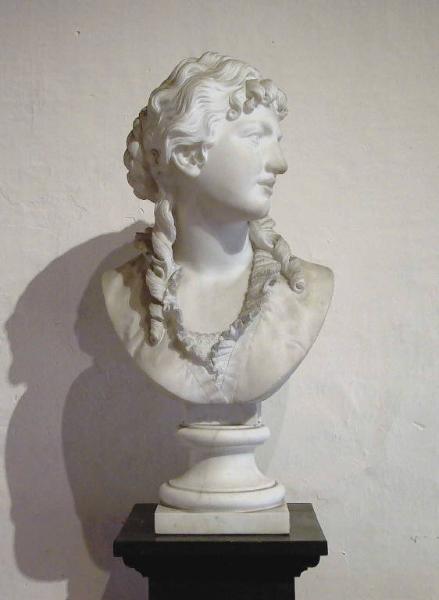 Busto di figura femminile visto frontalmente con la testa girata verso destra; indossa una camicia con la scollatura a V profilata di raffinato pizzo; i capelli sono raccolti sulla nuca; alcuni boccoli cadono sulle spalle.