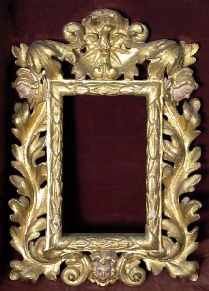 - NOTIZIE STORICO CRITICHE Stilisticamente attribuibile all'ambito della bottega di Giacomo Faustini, questa cornice, pendant dell'altra (inv. n. S00006) pure conservata nelle collezioni della Pinacoteca Repossi, non ha provenienza certa e solo per via ipotetica può essere collegata alla cornice maggiore (inv. n. S00009), cronologicamente successiva di almeno un quindicennio. In quest'opera si nota un gusto per l'intaglio ancora di poco rilevata plasticità, una carnosità delle volute meno spigliata che in seguito e, per alcune durezze nella conduzione dell'insieme, pare plausibile assegnarla alla bottega del Faustini più che alla sua mano, sebbene la concezione d'insieme riveli i caratteri propri della sua opera e la cifra stilistica che in genere lo contraddistingue nelle opere note degli anni Settanta-Ottanta.