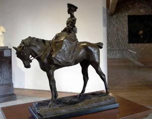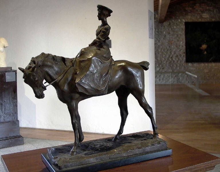 - NOTIZIE STORICO CRITICHE L'esile bronzetto dalla conduzione spigliata e realizzata per ampie superfici sulle quali la luce plana conferendo all'iniseme una grazia tutt'altro che greve, è un buon esempio della scultura prodotta all'interno del movimento della Scapigliatura del quale il Troubetzkoy fu uno degli esponenti di maggiore rilievo. Senza dubbio la stilizzazione alla quale l'artista sottopone le figure conferisce all'insieme un connotato di idealizzazione che è in consonanza con alcune soluzioni adottate dal Liberty e che sono intuibili anche nella flessuosità della linea, sebbene volutamente frammentata da certe spigolosità proprie dell'artista. Secondo Terraroli (1991, p. 80) si tratterebbe di "una tiratura tarda dal modello originale - risalente al primo decennio del Novecento - perché non risulta rifinita nei dettagli, né raffinate la pulitura e la brunitura finale".