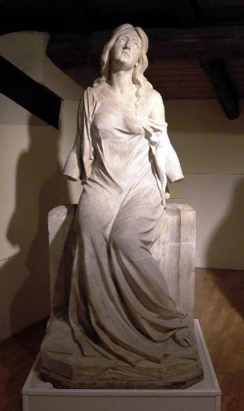 Figura femminile seduta con le braccia aperte e lo sguardo addolorato rivolto verso l'alto.
