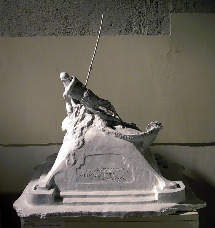 - NOTIZIE STORICO CRITICHE Vincitore del concorso indetto dalla municipalità di Chiari per l'erezione di un monumento ai Caduti della prima guerra mondiale, Tullio Borsato realizzò un complesso assai semplificato formato da blocchi sovrapposti e degradanti in grandezza verso l'alto al cui culmine pose una statua gigantesca raffigurante il fante-contadino. La scultura, lontana dalle coeve rappresentazioni del soldato vittorioso, raffigura un fante in un atteggiamento del tutto anti eroico e quotidiano il quale, abbandonato il fucile, si appoggia al manico di un badile (cfr. S00047 e S00072). L'elaborazione del monumento tenne occupato l'artista per un certo tempo e prova di questo intenso lavoro progettuale sono i diversi bozzetti in gesso che danno diverse versioni del tema al cui centro rimane, seppure in diverse pose, la figura solenne e gigantesca del soldato (cfr. S00031, S00047). In questo bozzetto dal basamento a tronco di piramide fuoriesce in parte la forma di una barca sulla quale campeggia la scritta VITTORIO VENETO; il soldato, teso nella posizione difficile, mostra tutta la forza concentrata del gesto di Borsato che, memore della scultura boccioniana e della tensione quasi espressionista di Adolfo Wildt, riesce a concentrare nel dinamismo della torsione del corpo tutta la volontà di rappresentazione eroica altrove divulgata con forme più usuali e scontate.