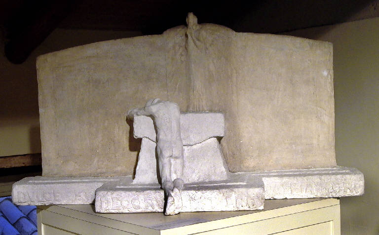 - NOTIZIE STORICO CRITICHE Affine nell'impostazione al bozzetto S00076 per la costruzione spaziale che riconduce al recinto sacro, questo bozzetto, essenziale nei tratti, presenta con maggiore drammaticità (ma anche con maggiore enfasi) il dramma del sacrificio per la patria, con il corpo nudo del soldato, riverso sopra un altare. A custodia del sacrario un'immagine simbolica dai tratti diafanamente femminili. Anche in questo caso si nota un'eco più forte della poetica simbolista e Liberty, sia nel trattamento delle masse che nella resa decorativa.