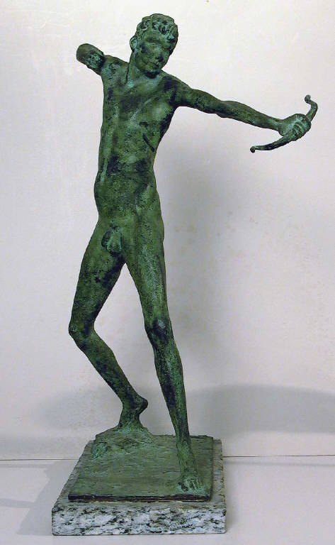 Figura maschile esile e nuda rappresentata nell'atto di tendere la corda dell'arco per scoccare la freccia; nella mano sinistra tiene un arco di piccole dimensioni; lo sguardo è fisso sull'arco.