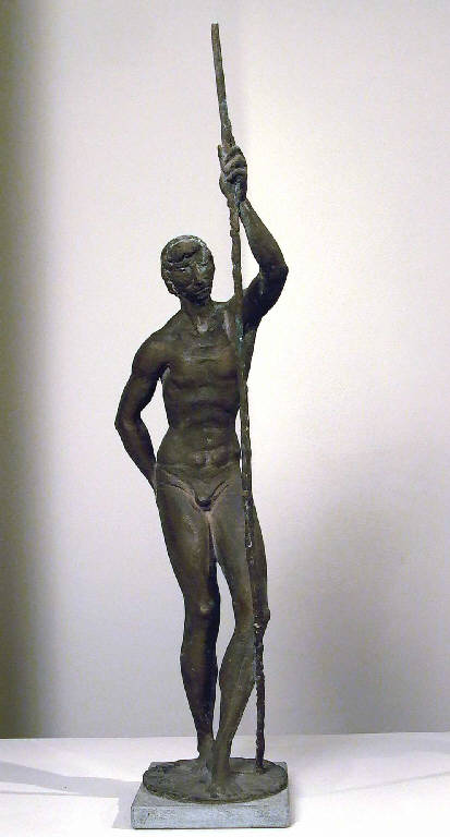 - NOTIZIE STORICO CRITICHE Come per l'Arcere (inv. n. S00082), anche in questo bronzetto della prima stagione artistica di Pelati si nota una stretta aderenza al magistero mariniano seppure vi si ravvisino elementi che sembrano giungergli dalla scultura di Repossi. Ciò che si accentua in questa scultura è l'espressionismo fisionomico che in qualche modo contrasta con il trattamento classicista (sebbene sfibrato e allungato nella modellazione) del resto della figura. L'artista tratta con estrema eleganza la figura senza indulgere in manierismi bozzettistici.