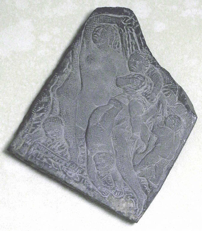 BAssorilievo con figura femminile con il braccio destra alzato dietro la testa e quattro bambini intorno a lei, in pose ed atteggiamenti vari.