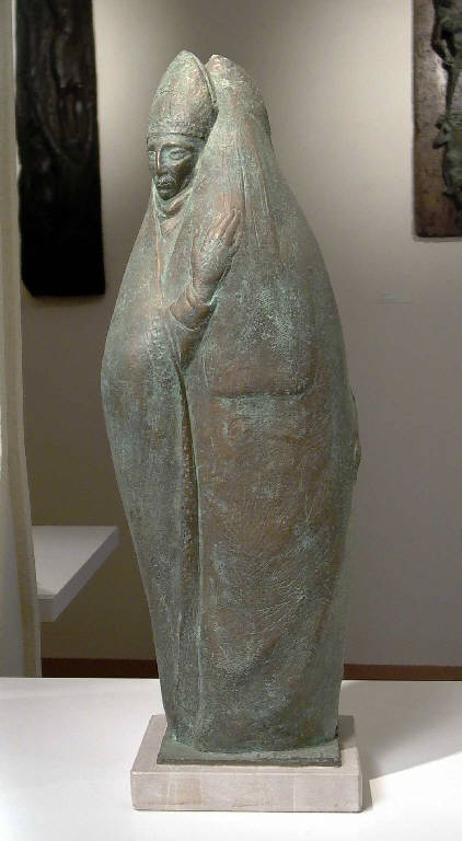 - NOTIZIE STORICO CRITICHE Concepito in forme chiuse e monumentali, seppure stilizzate e addolcite, il blocco bronzeo raffigurante due vescovi che si abbracciano, è di grande suggestione evocativa e mostra l'attenzione di Pelati per il fenomeno religioso. I due personaggi - ad indicare i risultati della pace - sono fusi in un unico corpo dal quale emergono solo per la testa e pochi altri particolari. A questo contribuisce il modellato essenziale e lineare e la concezione ancora soda e monumentale che contraddistingue i lavori dell'artista fino ai primi anni Sessanta.