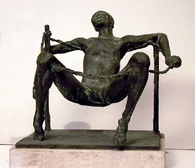 - NOTIZIE STORICO CRITICHE Emblematica della produzione di Pelati verso la metà degli anni Sessanta, questa piccola scultura, plasmata con vigoria e decisione, segue il filone dei vinti al quale l'artista si dedica proprio in questi anni. La figura, sebbene di piccole dimensioni, è fissata nei suoi tratti essenziali con aggressivo, essenziale realismo. Il pugile, dai tratti del viso tumefatti all'abbandono inanimato delle membra, rappresenta, nell'universo di Pelati, l'essenza della sconfitta umana davanti alle grandi prove della vita. Tratto dolorosamente autobiografico che l'artista mette in scena attraverso questa serie di personaggi di piccole dimensioni, imprigionati o messi all'angolo da forze più grandi e assolute alle quali non è possibile sottrarsi ma solamente inchinarsi.