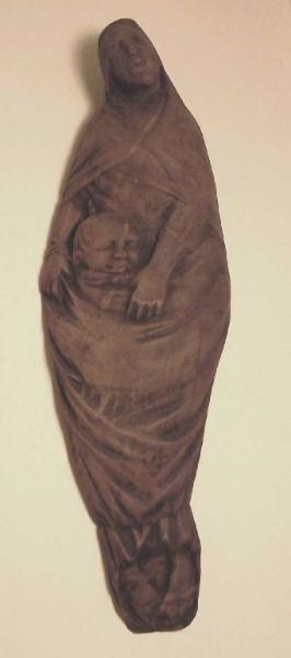 - NOTIZIE STORICO CRITICHE Il bassorilievo riprende in buona sostanza i caratteri stilistici e le tematiche ricorrenti nell'arte di Pelati. Qui le figure sono trattate, seppure strutturalmente siano ancora racchiuse in un unico complesso, con maggiore libertà e anche il modellato si fa più approfondito anche se meno tagliente di quanto si possa vedere in opere come il Guerriero (inv. n. S00097). L'immagine materna, dai tratti raddolciti, e la figura del bimbo, visibile solo parzialmente nel suo abbandono fiducioso, sembrano aderire più intimamente agli stilemi del classicismo di primo Quattrocento, solo attenuato dall'impronta personale dell'artista.
