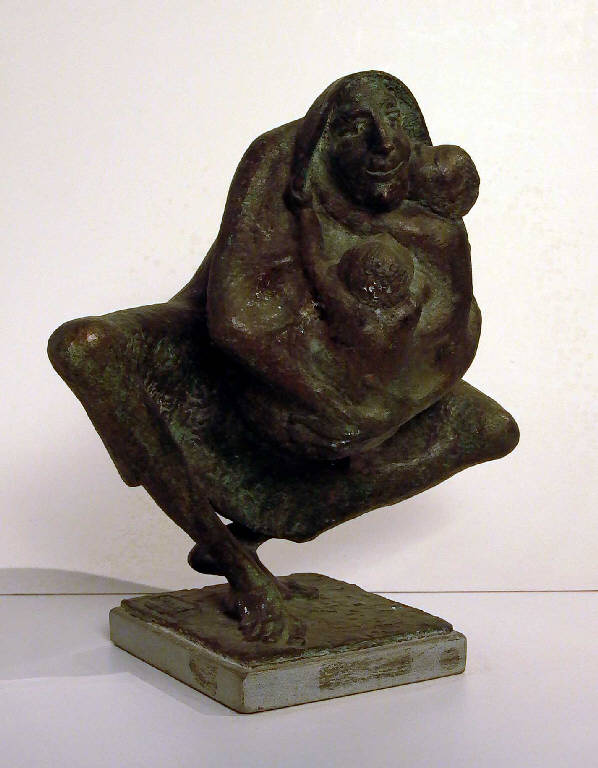 - NOTIZIE STORICO CRITICHE Il bronzetto dal modellato forte e dalle forme tese e dinamiche, ripropone in una delle molte variazioni messe in atto dall'artista, il tema della maternità. Qui la madre è una sorta di lupa che tiene al collo i suoi figli e li difende, pronta a scattare contro coloro che volessero impossessarsene. La struttura fortemente sfaccettata e ridotta a un grumo di presenze, si regge sulle due gambe scarnite della donna i cui piedi, quasi adunchi, farebbero pensare a un rapace più che a una lupa. Tuttavia la forza evocativa del pezzo è tutta racchiusa nel gesto protettivo della madre e in quella di fiducioso abbandono dei due piccoli: un gesto istintivo tradotto con finissima poesia.