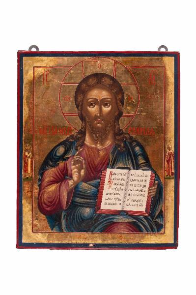 - NOTIZIE STORICO CRITICHE Pantocratore (dal greco "che tutto contiene", ma anche "denominatore universale" e "conservatore di tutti gli esseri"; in Occidente viene sovente tradotto con onnipotente), la più diffusa e nota icona cristologica. Il Cristo Pantocrator è raffigurato, nella nostra icona, secondo l'iconografia antica bizantina: il Salvatore è a mezzo busto, in posizione frontale ed ieratica; il volto e lo sguardo di Cristo sono molto intensi: dalla sua immagine si sprigiona un senso di potenza divina e al contempo di grande umanità. I lunghi capelli castani, divisi nel mezzo, ricadono ondulati sulla nuca e sulle spalle; il mento è contornato da una corta barba; la fronte spaziosa ha gli archi sopracciliari ben marcati; gli occhi grandi, profondi e pensosi, sono divisi dal setto nasale allungato fino alla fronte; le labbra appaiono rosse e strette in un silenzio contemplativo; le orecchie, piccole, sottolineano l'atteggiamento di ascolto. Gesù indossa una veste rossa, colore della regalità, sotto il manto dal colore azzurro-blu, simbolo della sua umanità. Cristo, mentre benedice con la destra secondo gesto trinitario, on la mano sinistra regge il Vangelo aperto sul passo: "Venite a me, voi tutti che siete stanchi e affaticati, e io vi darò ristoro"(Matteo, 11.28), come vuole la tradizione più antica. Per valorizzare l'aspetto ieratico del Pantocrator il fondo è assolutamente privo di architettura, mentre l'immagine prende luce dall'oro in foglia del nimbo e dall'uso dell'oro della crisografia e graffito nel panneggio delle vesti. Il nimbo che circonda il capo ha inscritta una croce in cui spiccano, in greco, le tre sacre lettere O ON (Io sono colui che sono: Esodo 3, 13-14): la O è al centro, in alto; l'omega a destra e la N a sinistra. Ai lati, in alto, rispettivamente a destra e a sinistra del volto, spiccano, rossi, sull'oro del fondo, i digrammi: IC XC, acronimo ottenuto dalla prima e ultima lettera delle due parole Gesù Cristo, scritte secondo l'alfabeto greco Iesous Christos . Nella cornice dell'icona sono raffigurati, come riportano le scritte in rosso: a destra san Nikita episcopo e, a sinistra, santa Agaphia , rivestiti dagli abiti e dai simboli del loto status. Il fondo oro, inciso negli abiti dei santi in cornice; la crisografia e il graffito ammantano di luce divina e regale l'intera icona.
