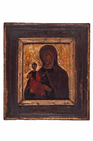 - NOTIZIE STORICO CRITICHE Il prototipo dell'icona della Madre di Dio "della Consolazione" si trova sul monte Athos, nel monastero di Vatopedi fondato durante il regno dell'imperatore Costantino il grande. Il nome deriva dalla quinta strofa dell'inno "Akathistos": Maria si fa carico del dolore dell'umanità e, nei lunghi anni dopo la passione di Gesù, porta il suo dolore fino alla "dormizione", quando riceve la sua consolazione eterna.\nIl nostro esemplare, che risale al primo quarto del secolo XVI, è della scuola iconografica che fiorì, sotto controllo della Serenissima Repubblica di Venezia, a Creta, in particolare dopo la caduta di Costantinopoli (1453).\nSu fondo oro (parecchio abraso) risalta la Madre di Dio che tiene con la destra il Figlio, seduto ben diritto sulle sua ginocchia e in atto benedicente; entrambi hanno il capo circondato da un nimbo d'oro. Gli incarnati, ottenuti sotto tinteggi in marrone scuro e denso, i grandi occhi assorti, la fissità delle posture ci parlano di una missione da compiere, sia da parte della Madre che del Figlio. Il rosso vivo del manto di Cristo e il porpora scuro del maphorion di Maria, lumeggiati dall'assist in foglia d'oro, ci parlano della loro divinità. Purtroppo l'equilibrio cromatico dei volti e dei panneggi è pregiudicato dall'imbrunimento dell'olifa. \nLa tavola è conservata in una cornice lignea dorata coeva: purtroppo ridipinta