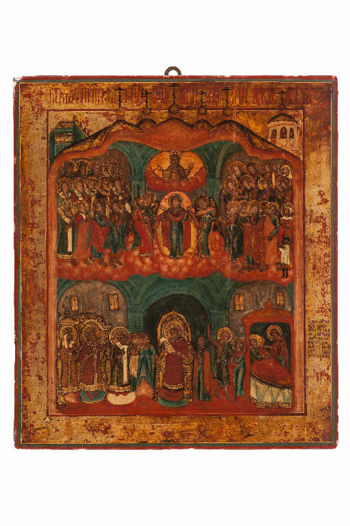 - NOTIZIE STORICO CRITICHE L'icona "Pokrov" rappresenta l'immagine della più importante solennità mariana, dopo quella della Dormizione della Madre di Dio. Le prime icone con la raffigurazione del Pokrov risalgono alla metà del XII secolo e la loro comparsa è collegata al nome del principe di Vladimir Andrej Bogoljubskij, benché ci siano motivi per supporre che il principe abbia mutuato una tradizione già esistente a Kiev. La festa è celebrata il 1 ottobre ed è molto sentita dal popolo russo. Essa appartiene al novero delle feste che nacquero nella Chiesa russa e non esistono nel calendario liturgico di altri paesi ortodossi, ciononostante le fonti letterarie che sono alla base del soggetto sono di origine bizantina. Una di esse è la Vita di Andrea "folle per Cristo", santo di Costantinopoli vissuto nel X secolo. Secondo questa narrazione, durante l'assedio della capitale bizantina da parte dei saraceni a sant'Andrea, mentre pregavano nel tempio di Blacherne insieme al suo discepolo Epifanio, apparve la Madre di Dio. Era circondata da un cortei di santi. Quando il corteo raggiunse l'ambone, Andrea si rivolse al suo discepolo Epifanio mostrandogli l'apparizione miracolosa. Terminata la preghiera, la Vergine si avvicinò al santuario, stese il velo con le sue mani e ne coprì tutto il popolo che stava in chiesa.\nL'icona "Pokrov" (Protezione) ha dunque una composizione "sinottica" di quattro elementi, inseriti in una cornice dorata: la reliquia del velo della Vergine, la visione di sant'Andrea il Folle, il "miracolo abituale" e il miracolo di san Romano, che formano uno sfondo teologico da cui emerge l'idea centrale del Pokrov, cioè l'esperienza secolare della protezione della Vergine. \nNel nostro esemplare, che proviene dalla scuola iconografica bielorussa dei Vecchi credenti (setta nata in seno alla Chiesa ortodossa durante lo scisma seguito alle riforme di Nikon nella seconda metà del XVII sec.) dell'isola di Vetka, all'interno dello spaccato del santuario di Blacherne (si noti la prospettiva, che permette di vedere sia l'esterno -il grande tempio a più cupole-, sia l'interno), la Vergine, in una mandorla d'oro, sospesa su rosee nubi, avvolta nel maphorion rosso, circondata da due angeli e da una moltitudine di santi, chini verso di lei, tiene fra le braccia alzate il velo che scende dai cieli e protegge l'assemblea. Su di lei benedice, solenne, il Cristo Pantocrator. Nel registro inferiore, fra le verdi navate del tempio spicca la figura seminuda di Sant'Andrea il Folle che indica al suo discepolo Epifanio l'apparizione della Vergine che, toltasi il velo scintillante e allargatolo con maestà, lo stende a protezione dell'umanità. A dx e a sx di Andrea il Folle è raffigurata la storia di uno dei maggiori innografi bizantini: san Romano il Melode. La tradizione narra che possedesse una voce sgraziata, finché la Vergine gli apparve facendogli il dono del canto: ecco, infatti, in basso, a sx per chi guarda, la Vergine che appare al capezzale di Romano ordinandogli di inghiottire un rotolo; eseguito il comando, miracolosamente il diacono ottiene il dono del canto e il genio della composizione, che userà per tutta la vita a lode della Vergine. Ecco, infatti, al centro dell'icona, in piedi davanti a un prezioso ambone, san Romano in veste diaconale rossa a ramages scuri e orlata da greche d'oro: egli sta cantando il suo celebre Kondakion di Natale, scritto sul cartiglio che tiene in mano: lo ascoltano, ammirati (ritratti alla sua dx) il patriarca Macario e la corte imperiale dell'imperatore Leone e dell'imperatrice Zoe, incoronati e rivestiti di suntuose vesti.\nL'icona spicca per il cromatismo dei suoi colori, per la crisografia, il graffito e le sottili incisioni nella foglia d'oro degli abiti e sull'ambone a forme di trono.\nLa tavola è ricoperta da una ricchissima riza in metallo argentato, sbalzato e cesellato.