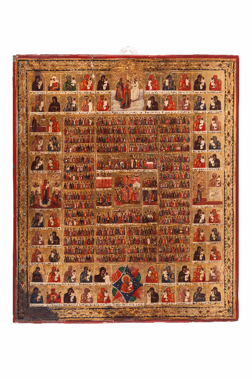 - NOTIZIE STORICO CRITICHE Queste icone raffigurano su un solo pannello i santi e le feste per tutti i giorni di uno o più mesi dell'anno, secondo il calendario fisso, vale a dire quelle commemorazioni che non dipendono dalla data variabile della Pasqua.\nIl nostro esemplare, dell'ultimo quarto del XIX secolo, proviene dall'importante centro iconografico russo di Choluj (governatorato di Vladimir) ed è un menologio di tutto l'anno. Entro una cornice aurea incisa a losanghe, sono raffigurati tre cicli con al centro l'icona della Pasqua rappresentata, su due registri, secondo la tradizione russa in uso a partire dal XVI secolo: in alto, il Cristo, in una mandorla rossa lumeggiata d'oro, sorge dal sepolcro; in basso, discende nell'Ade, ove riscatta Adamo, Eva e gli altri Giusti dalle fauci infernali.\nNel ciclo più interno sono rappresentati momenti significativi della Passione di Cristo, insieme alla raffigurazione della Trinità veterotestamentaria: Entrata in Gerusalemme/ Lavanda dei piedi / Ultima cena / Cristo nell'orto del Getsemani /Bacio di Giuda o / Cristo viene flagellato / Cristo viene incoronato di spine / Cristo sale al Golgota con la croce / Viene crocifisso /Viene deposto dalla croce / Cristo viene sepolto.\nL' intera sequenza annuale di santi (500 raffigurazioni) , suddivisi per decina in 48 registri, forma il secondo quadrato intorno al centro: l'iconografo dipinge una miriade di miniature (horror vacui?), diversificando, per la loro tradizionale tipologia, ogni santo: si tratta di una sorta di affollata e sgargiante adunanza, più folkloristica che liturgica, al punto che la si può paragonare a una sorta di tappeto multicolore.\nIl ciclo più esterno rappresenta tipologie mariane (ben 68!): Incoronazione della Vergine, Gioia di tutti gli afflitti e Gioia inaspettata, Madonna di Kazan, di Smolensk, di Tichvin, di Vladimir, di Iver, di Bogolijub, del Segno di Gerusalemme: ognuna con la propria didascalia, i propri simboli e colori che ne permettono l'identificazione! Al centro di questo ciclo, in alto, davanti alla raffigurazione della "Trinità del Nuovo testamento", Maria è ritratta in manto rosso, già tutta santa accanto a Dio; al centro in basso, invece, si nota La Madre di Dio, "Roveto Ardente" a mezzo busto, con in braccio il Divin Bambino; la raffigurazione trae ispirazione dall'episodio biblico della visione a Mosè sul monte Oreb. Il "roveto incombusto" è rappresentato nell'icona da una doppia stella a quattro punte (detta anche stella a otto punte) di cui quattro verde-azzurro per richiamare l'arbusto, quattro rosse, per suggerire la fiamma; la doppia stella è a sua volta inserita su di un fiore sbocciato (Rosa Mistica, Rosa Immarcescibile), che rappresenta l'eterna purezza di Maria.