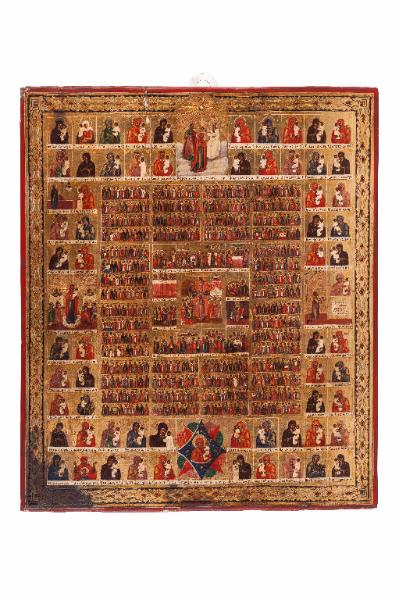 Icona che raffigura su un solo pannello i santi e le feste per tutti i giorni di uno o più mesi dell'anno. Sono raffigurati tre cicli con al centro l'icona della Pasqua: in alto, il Cristo, in una mandorla rossa lumeggiata d'oro, sorge dal sepolcro; in basso, discende nell'Ade, ove riscatta Adamo, Eva e gli altri Giusti dalle fauci infernali. Nel ciclo più interno troviamo i momenti della Passione di Cristo e la Trinità veterotestamentaria: Entrata in Gerusalemme/ Lavanda dei piedi / Ultima cena / Cristo nell'orto del Getsemani /Bacio di Giuda o / Cristo viene flagellato / Cristo viene incoronato di spine / Cristo sale al Golgota con la croce / Viene crocifisso /Viene deposto dalla croce / Cristo viene sepolto. Il ciclo più esterno rappresenta sessantotto tipologie mariane.