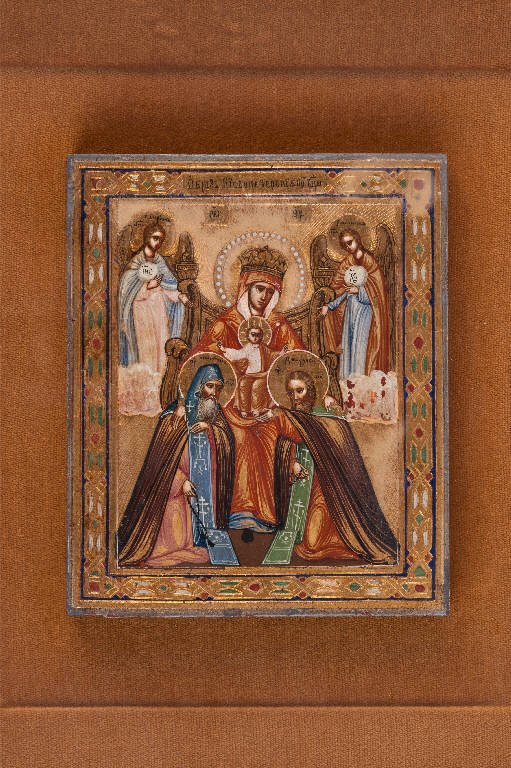 - NOTIZIE STORICO CRITICHE La storia dell'icona della Madre di Dio delle Grotte (Pecerskaja Bogomater), fra le più antiche immagini mariane onorate in Russia, è legata a quella del celebre Monastero delle Grotte (Pecerskij) di Kiev e dei suoi fondatori, Antonij e Feodosij, santi monaci fra i più popolari della Russia. La tradizione la vuole dipinta dal monaco Alipij, il primo iconografo russo di cui conosciamo il nome. \nLa nostra icona, proprio della Scuola ucraina del Monastero delle grotte di Kiev, risale al terzo quarto del XIX secolo; è "scritta", su tavoletta di ciliegio, a tempera all'uovo e lacche. Al centro, su fondo oro inciso, campeggia la Vergine seduta su un trono regale, ricoperta da manto color porpora, lumeggiato da pennellate d'oro, (simbolo di regalità e divinità), e da una veste blu (simbolo di umanità); porta, sul maphorion scarlatto, una corona da basilissa e il suo capo è ornato da un nimbo orlato di bianche perle. Ella reca seduto in grembo Gesù, vestito da un manto porpora dagli ampi panneggi, che ricade da una spalla; il chitone è bianco. Egli è già adolescente e benedicente con le braccia aperte e le dita delle mani unite secondo il gesto trinitario; nel suo nimbo d'oro, orlato di bianco, sono scritte in greco le sacre lettere O On = colui che sono (Esodo 3, 13-14). La Madre di Dio, a braccia spalancate, abbraccia i fondatori della laura di Pecersk: a sx (per chi guarda), sant'Antonio e, a dx, san Feodosij (Teodosio); inginocchiati, vestiti, dell'abito monastico Antonio, e da igumeno Teodosio, guardano verso il mondo supplicando intercessione per l'umanità. Il corpo degli asceti scompare sotto i lunghi mantelli monacali, che avvolgono vesti rosa e arancio crisografate; gli omophorion, l'uno azzurro, l'altro verde, portano ricamati i simboli della Passio; la mano destra di entrambi sgrana un rosario, mentre con la sinistra Teodosio regge un piedino del Bambino.\nI volti -barba, capelli e baffi bianchi per sant'Antonio, castani per San Teodosio- sono lumeggiati di chiaro con pennellate rosee sugli zigomi; diversamente dai canoni iconografici, le loro gote non mostrano rughe; analogamente i volti di Maria, del Figlio e degli arcangeli che reggono, da un cuscino di soffici nuvole, il trono, hanno carnagione chiara e rosata, quasi splendente. Gli arcangeli, dalle vesti pastello e dalle ali d'oro, recano sul petto un disco bianco in cui sono inscritti (a sx) il trigramma che sta per Gesù e a dx il digramma di Cristo. \nTutti hanno il capo aureolato da un nimbo d'oro simbolo di santità. La crisografia impreziosisce la raffigurazione iconografica, racchiusa in una cornice a losanghe colorate. La piccola icona, che è custodita in teca contemporanea, ispira un senso di grande pace e serenità.