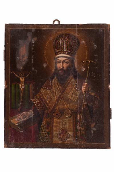 - NOTIZIE STORICO CRITICHE Figura fondamentale per la Chiesa russa e per l'Ortodossia, Dimitry di Rostov nacque a Makarovo nella regione di Kiev nel 1651 con il nome di Danylo Savvich Tuptalo (o Tuptalenko). Trasferitosi a Kiev, entrò nell'accademia della città studiando teologia. Nel 1668) prese i voti nel monastero di san Cirillo a Kiev con il nome monastico di Dimitry; alcuni anni dopo divenne egumeno. Nel 1702 venne nominato metropolita di Rostov, ove fondò una scuola e un teatro. Condusse vita ascetica di preghiera e di digiuno molto rigido e spesso ebbe visioni celesti. Grande oratore, era famoso per la sua eloquenza. Scrisse numerosi sermoni, saggi politici e storici, il trattato teologico "Lo specchio della fede ortodossa" e il dramma "La dormizione della Madre di Dio"; l'opera di maggiore rilievo è "La vita dei santi" redatta in 12 volumi scritti tra il 1684 e il 1705. Fu anche compositore e scrisse numerosi salmi che i Kobzari (menestrelli ambulanti) adattarono a canzoni popolari diffondendoli in Ucraina e nei Balcani. \nLa nostra icona, di Scuola della Russia centrale, risale al secondo quarto del XIX secolo; "è scritta" a olio, su una tavola lignea formata da tre assi con due traverse convergenti e cieche; il retro della tavola, anch'esso dipinto ad olio, riporta un'iscrizione non più leggibile. Il dipinto, con colori tutti giocati sui toni del marrone e del rosso cupo (resi più scuri anche dall'imbrunimento dell'olifa), sintetizza la vita impegnata e poliedrica di Dimitrij: il metropolita è raffigurato in tutto lo splendore delle vesti e simboli liturgici: mitra con incastonati smeraldi e zaffiri e con le raffigurazioni della Madre di Dio e di Cristo; pastorale cesellato, che termina a Tau; due catene d'oro con medaglioni: uno a forma di losanga e uno rotondo; stikarion con polsi finemente ricamati; omophorion incrociato sul petto, con broderie a fili d'oro, come il fastoso sacchos che lo ricopre; al centro dell'omophorion una losanga quadrilobata, all'interno di una croce fiorata, mostra una piccola icona della Madre con il Figlio. Lo studioso e lo scrittore sono esemplificati dalla mano destra posata su un pacco di tomi e di fogli sparsi, che si trovano su uno scrittoio con alzata piena di volumi; sullo scrittoio un crocifisso da tavolo, con piedistallo, ricorda l'impegno di Dimitrij in ambito storico-teologico. Il punto focale -da tradizione canonica- è il volto, incorniciato da lunga barba e lunghi capelli ricadenti sulle spalle; la bocca, incorniciata da baffi alla mongola, è chiusa sul Mistero; il naso nobile, allungato fino alle sopracciglia, e gli occhi grandi, bruni e profondi, catalizzano l'osservatore; ma lo sguardo non è rivolto a chi osserva; è rivolto "in interiore", a scandagliare l'animo aperto sull'Aldilà. Non manca il nimbo della santità, orlato non dal rosso tradizionale, ma da una scritta in slavo che caratterizza l'icona: San Dimitrij metropolita di Rostov.\nLa tavola è ricoperta da una Riza in argento finemente sbalzato, cesellato e inciso. La Mitra è contornata da cristalli colorati (alcuni perduti) con smalti blu nel fondo delle raffigurazioni della Madre di Dio e di Gesù Cristo. Punzoni di Mosca, 1844, maestro di saggio A·K Andrej Koval'skij 1821-1856; maestro argentiere HH (NN) Nicholai Nikitin (?), attivo a San Pietroburgo dal 1845 al 1874. Sulla riza, sotto lo sbalzo del libro, vi è un'iscrizione commemorativa datata 8 dicembre 1842 - Mosca.